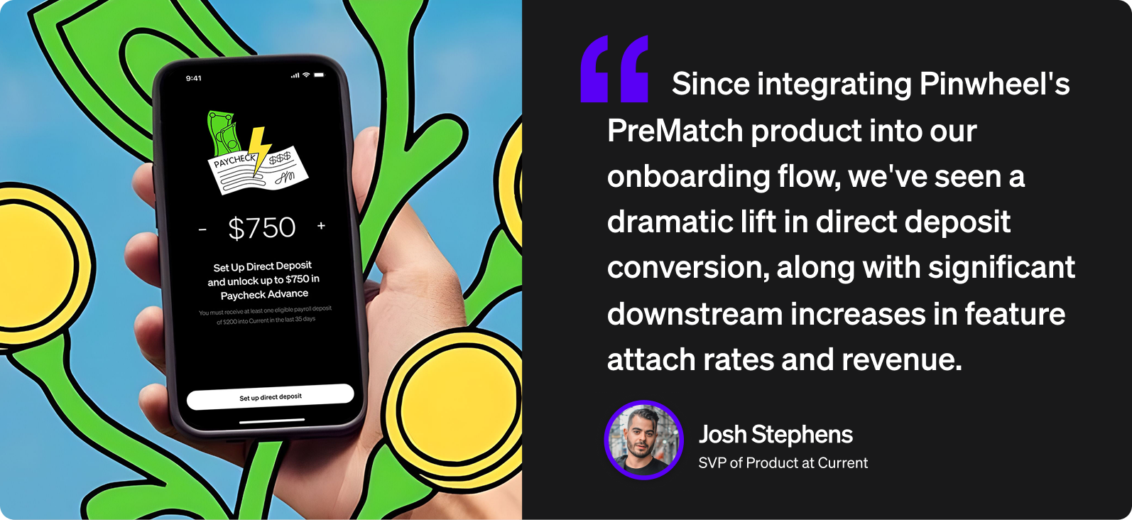 “At Current, conversion to direct deposit is a critical metric as it provides a clear, early signal that we’re becoming someone’s primary financial relationship. Since integrating Pinwheel's PreMatch product into our onboarding flow, we've seen a dramatic lift in direct deposit conversion, along with significant downstream increases in feature attach rates and revenue,” said Josh Stephens, SVP of Product at Current.