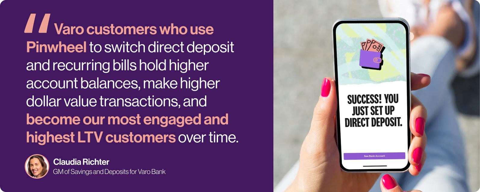 “We have been fortunate to partner with Pinwheel on continuously delivering the most cutting edge digital banking experience for Varo’s customers,” said Claudia Richter, GM of Savings and Deposits for Varo Bank. “Having a delightfully simple account activation journey has been core to our success, with deposit and bill switching key drivers of profitability. ”